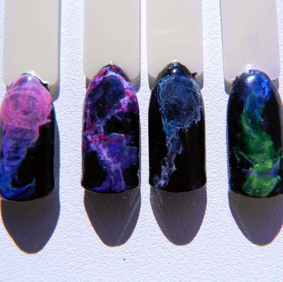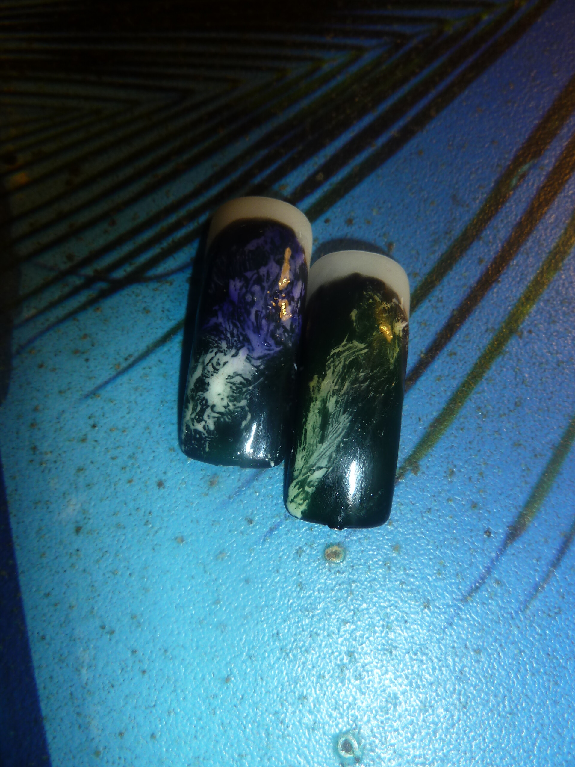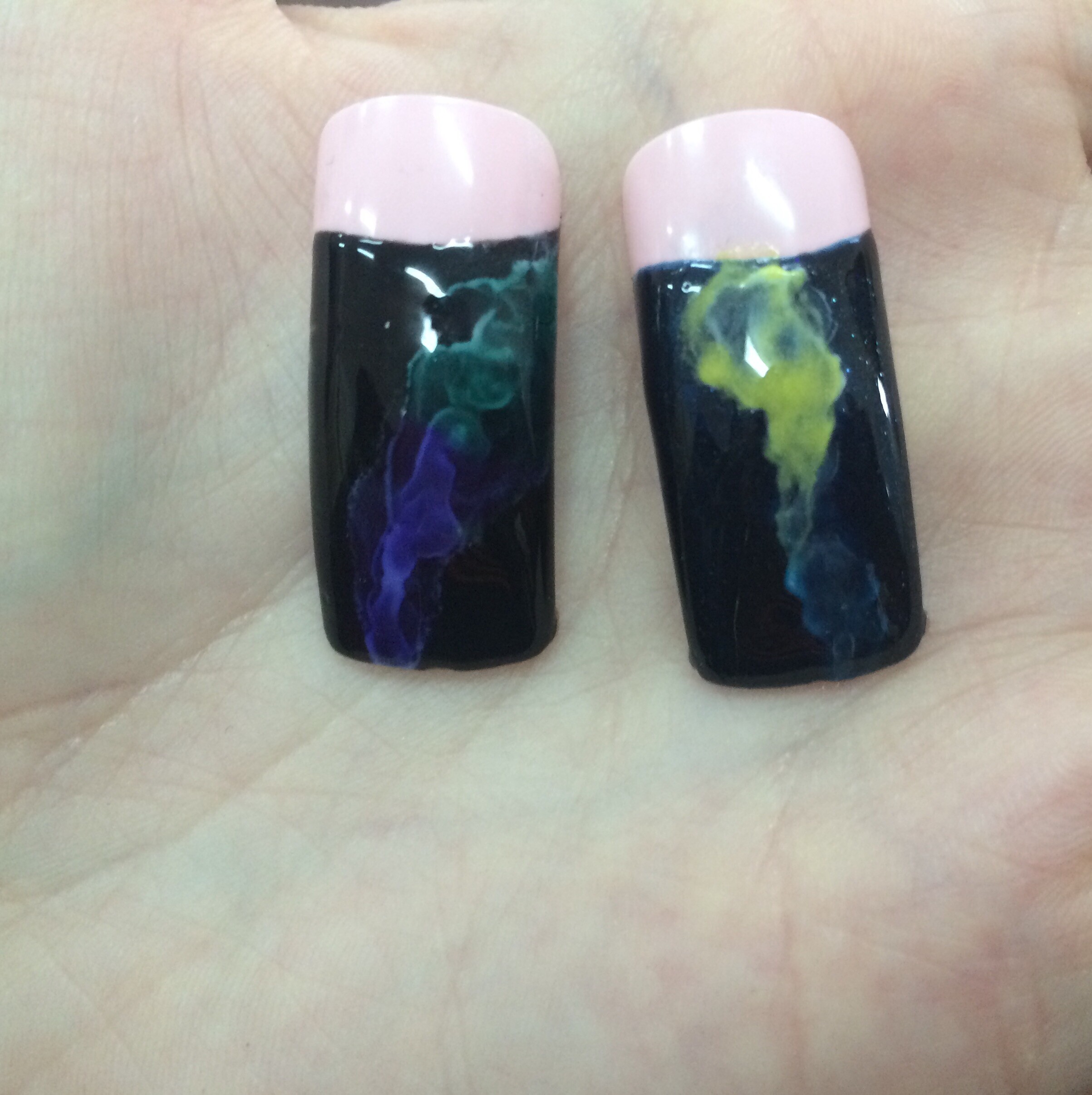 - Мешаем два цвета витражных красок с топ-покрытием для гель-лаков. Наносим один цвет на половину тонким слоем. Сушим.