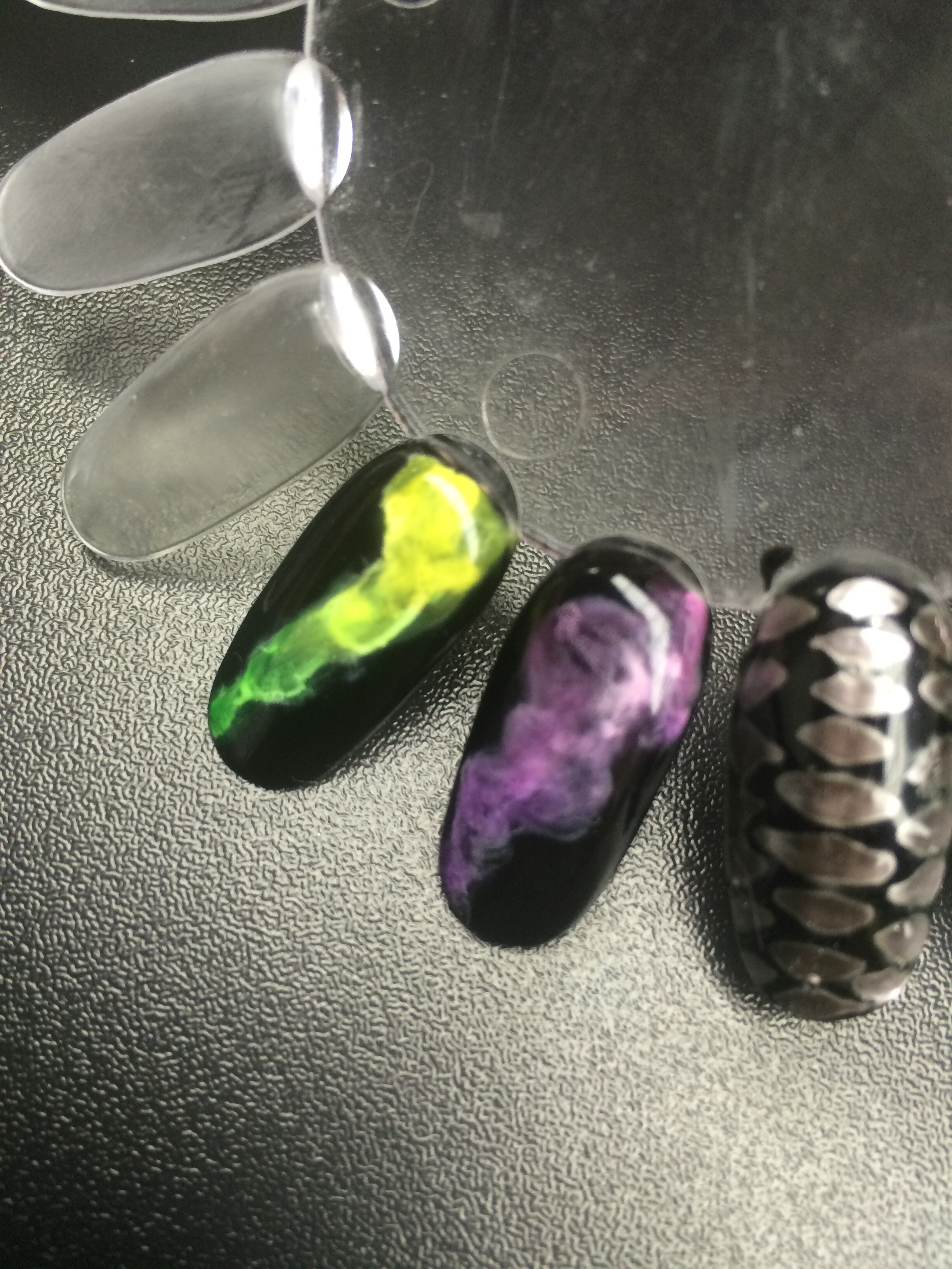 Расскажите, пожалуйста, подробнее технологию нанесения топа в данном дизайне. Меня смущает снятие липкого слоя с черного цвета, и конец процедуры