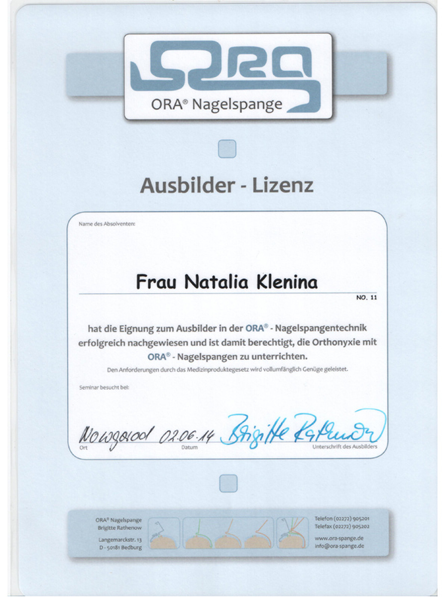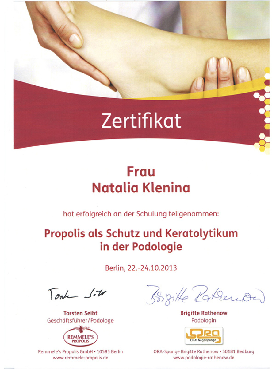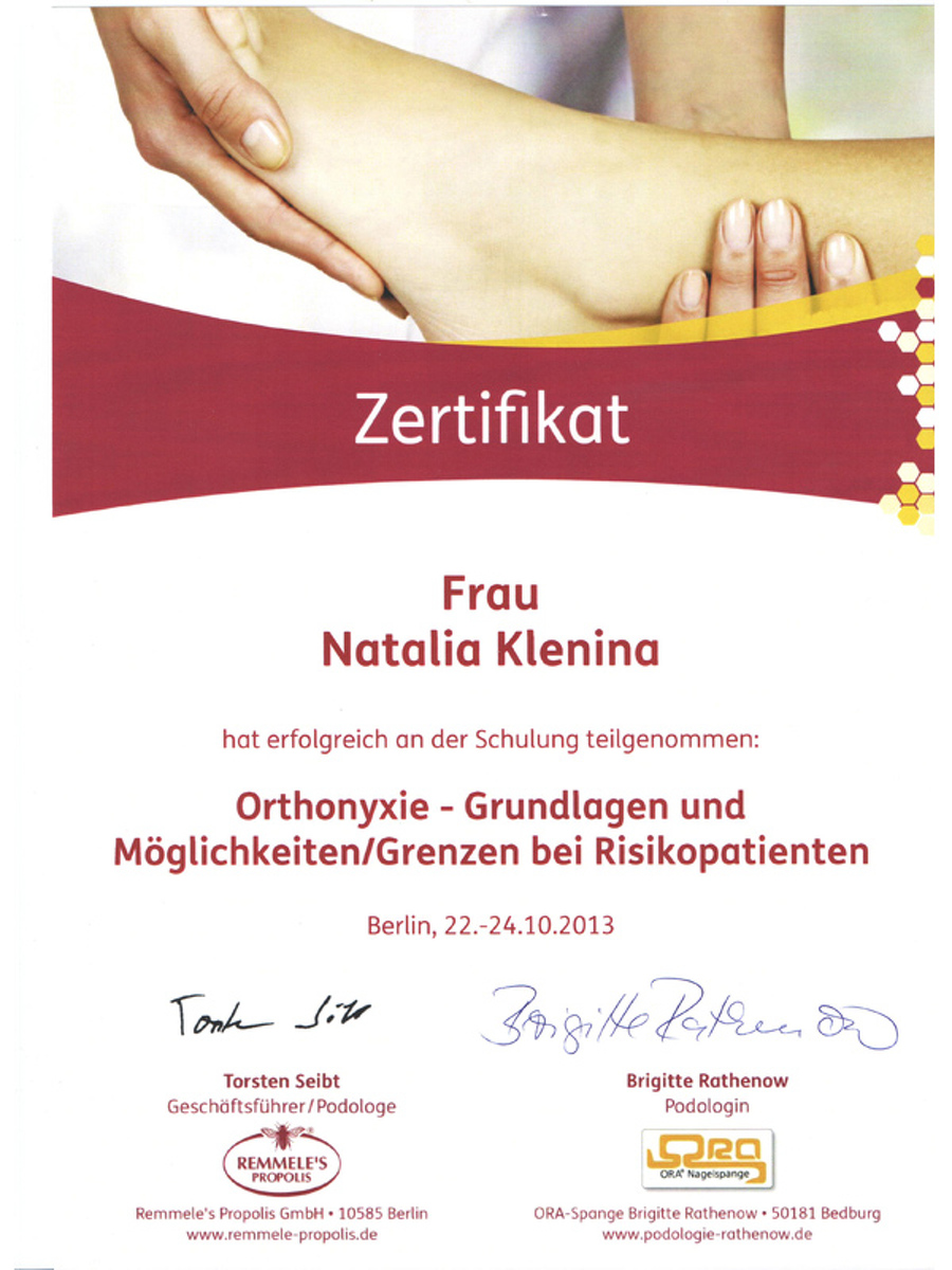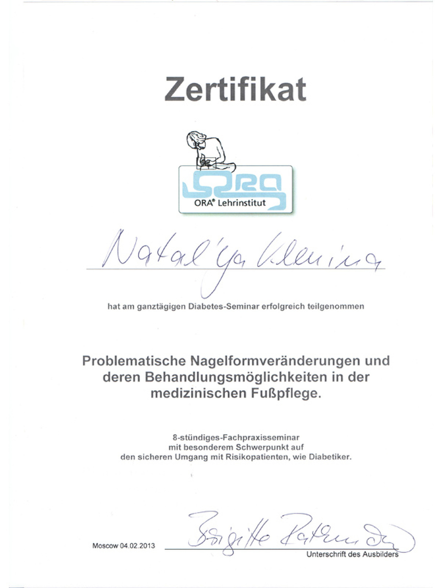 На базе диабетического центра Кристины Прале в Берлине я изучила способы работы с диабетической стопой. Бригитта Ратенов, автор уникальной скобы Оra-nagelspange, преподавала мне тонкости коррекции вросшего ногтя без операционного вмешательства.