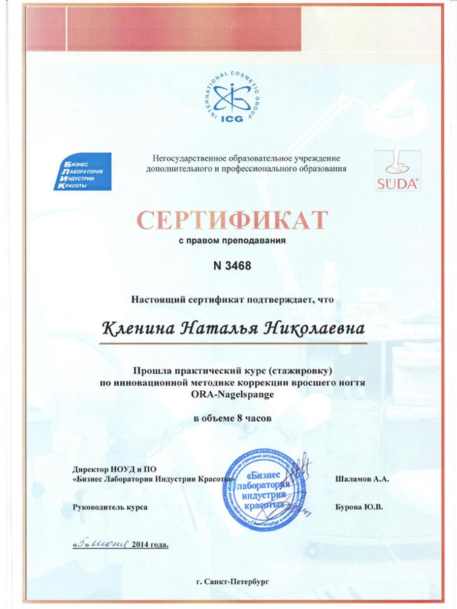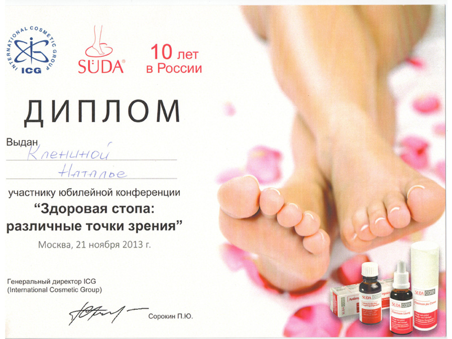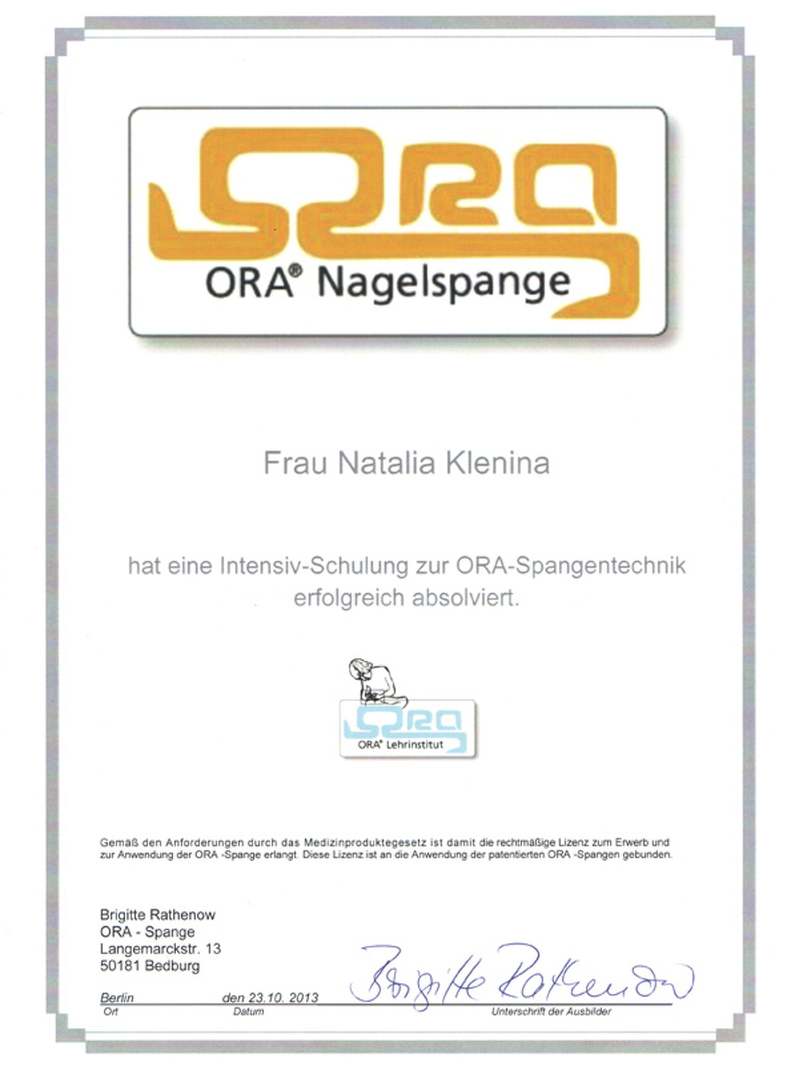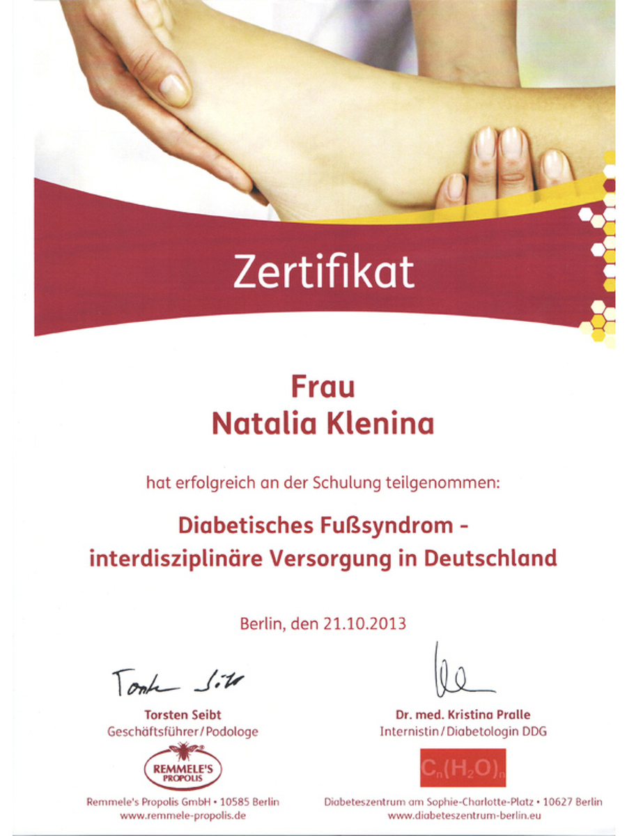 На базе диабетического центра Кристины Прале в Берлине я изучила способы работы с диабетической стопой. Бригитта Ратенов, автор уникальной скобы Оra-nagelspange, преподавала мне тонкости коррекции вросшего ногтя без операционного вмешательства.