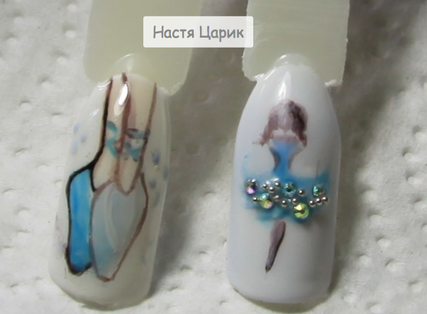 - Нарисуем балерину в голубом платье со стразами;
