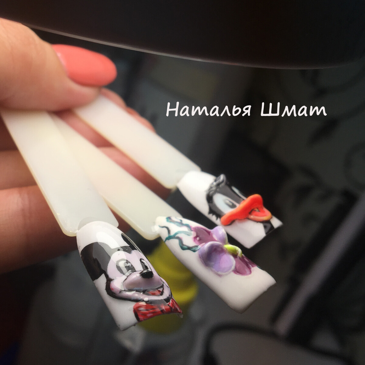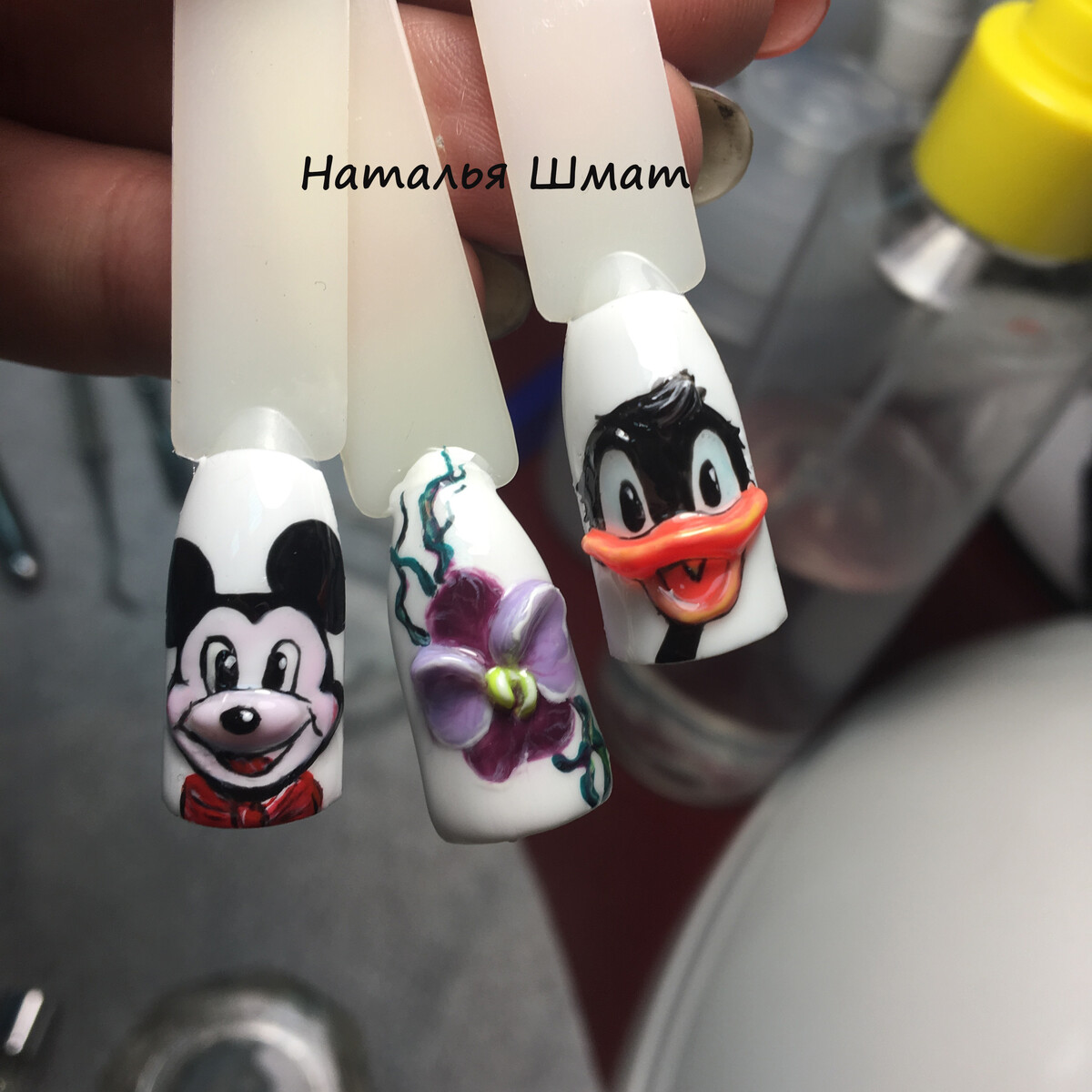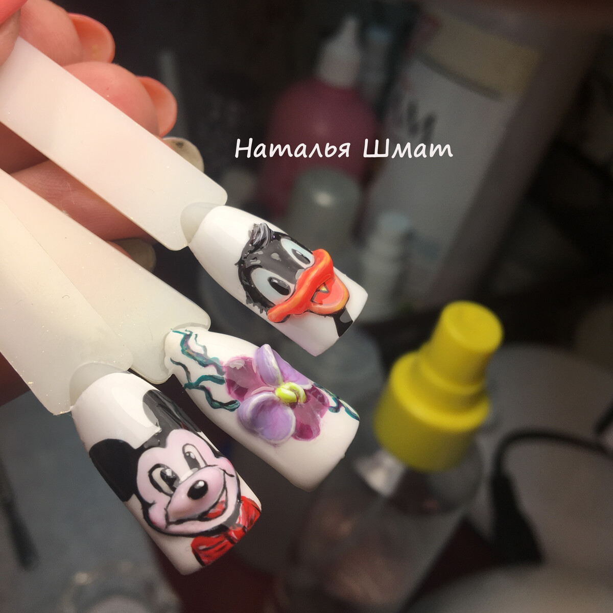 - Практическая отработка на типсах: фиалка, Дональд Дак.